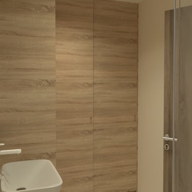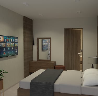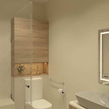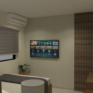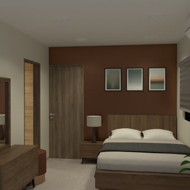Se diseñó un baño con vestidor en acabados claros, buscando ampliar visualmente el espacio y mantener una atmósfera luminosa y ordenada. La recámara se resolvió en tonos cálidos y con una decoración sutil, creando un ambiente relajante que favorece el descanso.